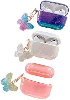 ggsmile Airpodspro ケース AirPodsケース キラキラ キュート 保護ケース クリエイティブ ハード クリア カバー キーホルダー キャラクター ハート 動物 キラキラ 蝶 貝 ストラップ (AirPods Pro, ピンク-蝶)