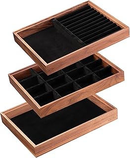 Kriss Art スタッカブル ブラック クルミ材 ジュエリー トレイ ドレッサー 引き出し オーガナイザー ジュエリー アクセサリー ガジェット 収納 ディスプレイ ショーケース ホルダー ボックス 3個セット