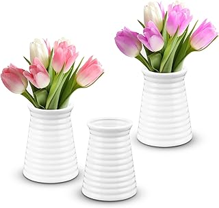 MyGift リブデザイン スモールホワイトセラミックフラワー花瓶 3個セット