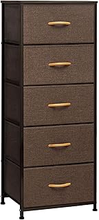 DHMAKER 縦型ドレッサー収納タワー スチールフレーム 木製トップ 簡単に引っ張るテクスチャードファブリックビン - オーガナイザーユニット 寝室 廊下 玄関 クローゼット - 5つの引き出し - ブラウン
