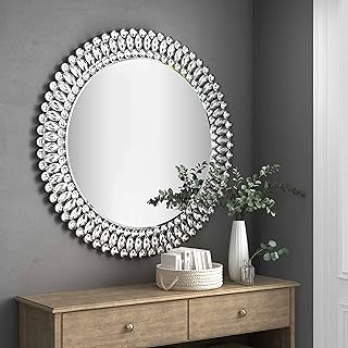MUAUSU ラウンド装飾ウォールミラー - エレガントなクリスタルアクセントサークルミラー 大型 モダン ラグジュアリー ダイヤモンド ファンシーシルバーミラー 32インチ x 32インチ 寝室 玄関 リビングルーム 廊下用